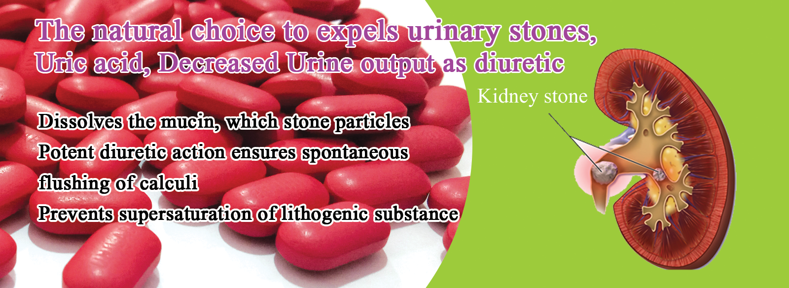 Oxalate stones, Uric acid and urate calculi, Crystalluria, Prevents post-operative recurrence of calculi, Cystitis, Burning micturition & as a Diuretic.